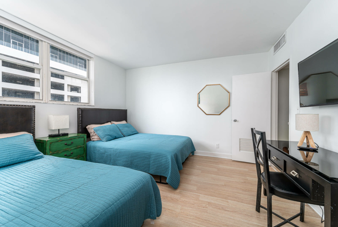 Just steps to the beach with spectacular sunrise ocean views. Spacious 2 bedroom, 2 bathroom split floor residence located on the 7th floor. Master bedroom features a king bed and on-suite bathroom. Second bedroom features 2 queen beds and on-suite bathroom. Kitchen is fully equipped for all your cooking needs. Southern exposure with tons of natural light. Cable & internet included.